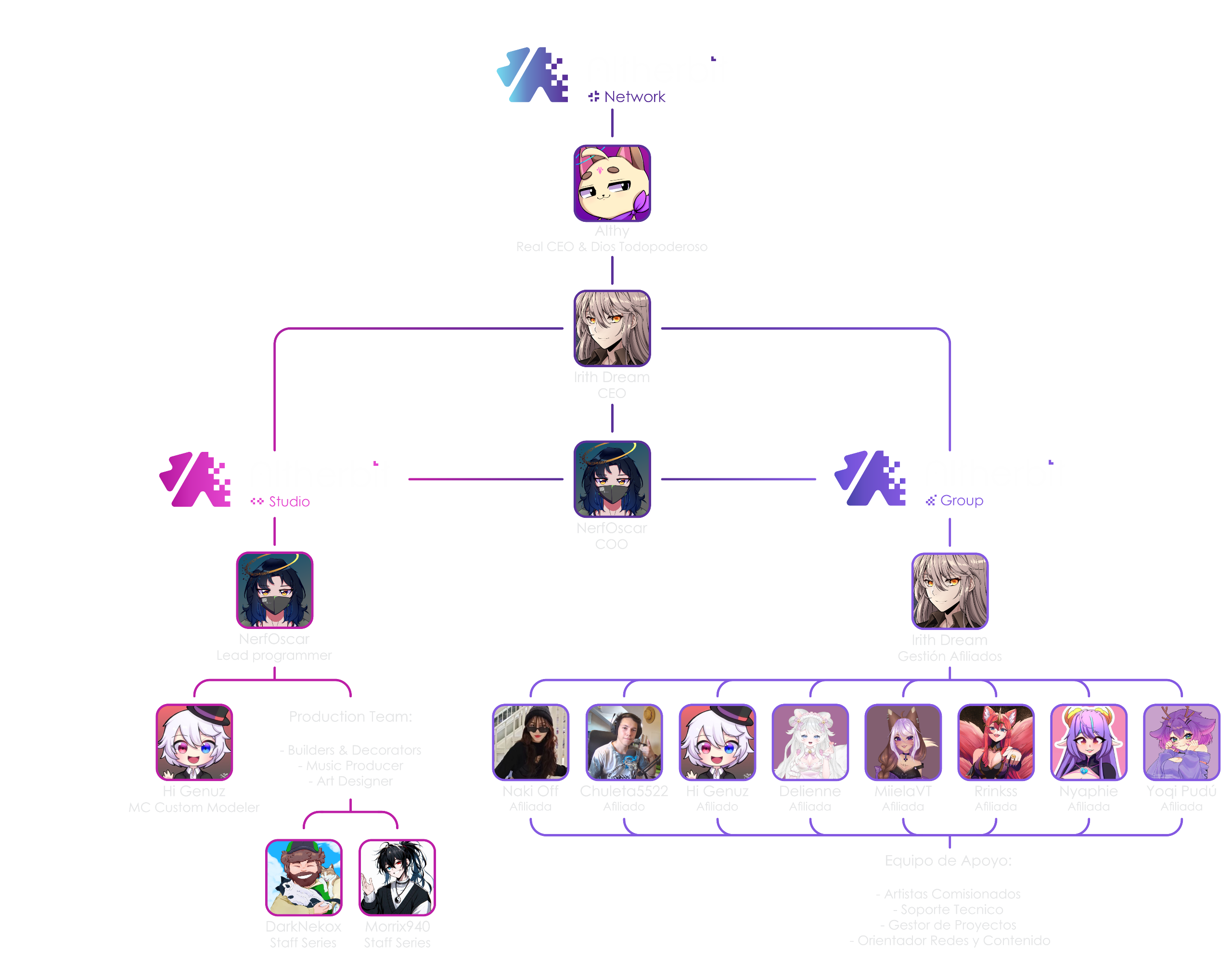 Somos una Network que cuenta con 2 divisiones totalmente enfocadas a la creación de contenido, donde sin importar si eres vtuber o streamer nos apoyaremos mutuamente como una gran familia.